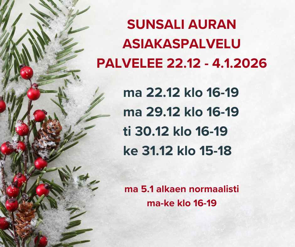 SunSali Aurassa ja Riihikoskella ovat avoinna vuoden jokaisena päivänä. Ilmaiset isot parkkipaikat, joten meille on helppo tulla. SunSalilla on ihmisläheinen ja iloinen henkilökunta valmiina palvelemaan sinua. Tervetuloa liikkumaan yksin tai yhdessä!