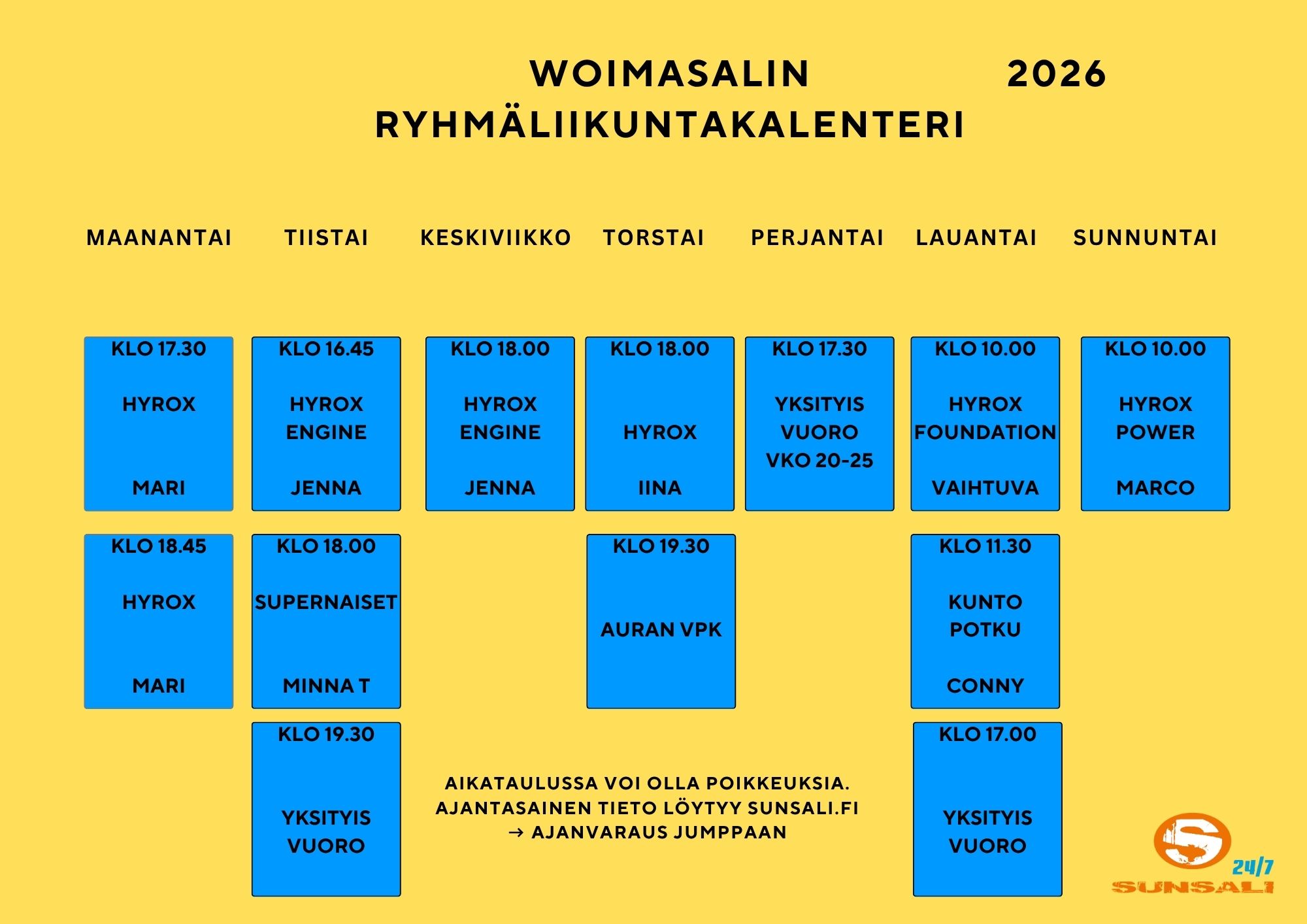 Ryhmäliikuntatuntien aikana Woimasalin treenisali on vapaasti muiden asiakkaiden käytössä.